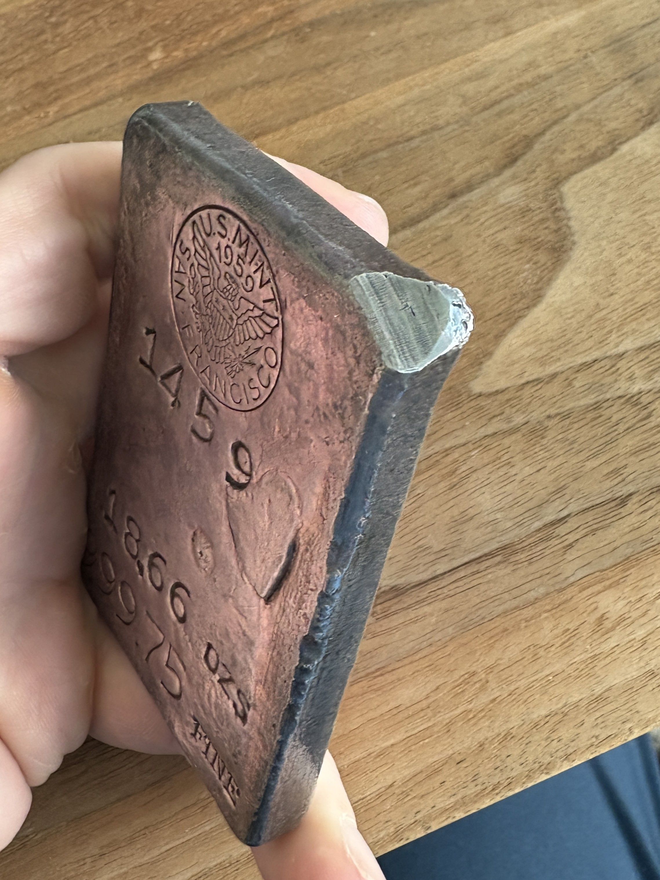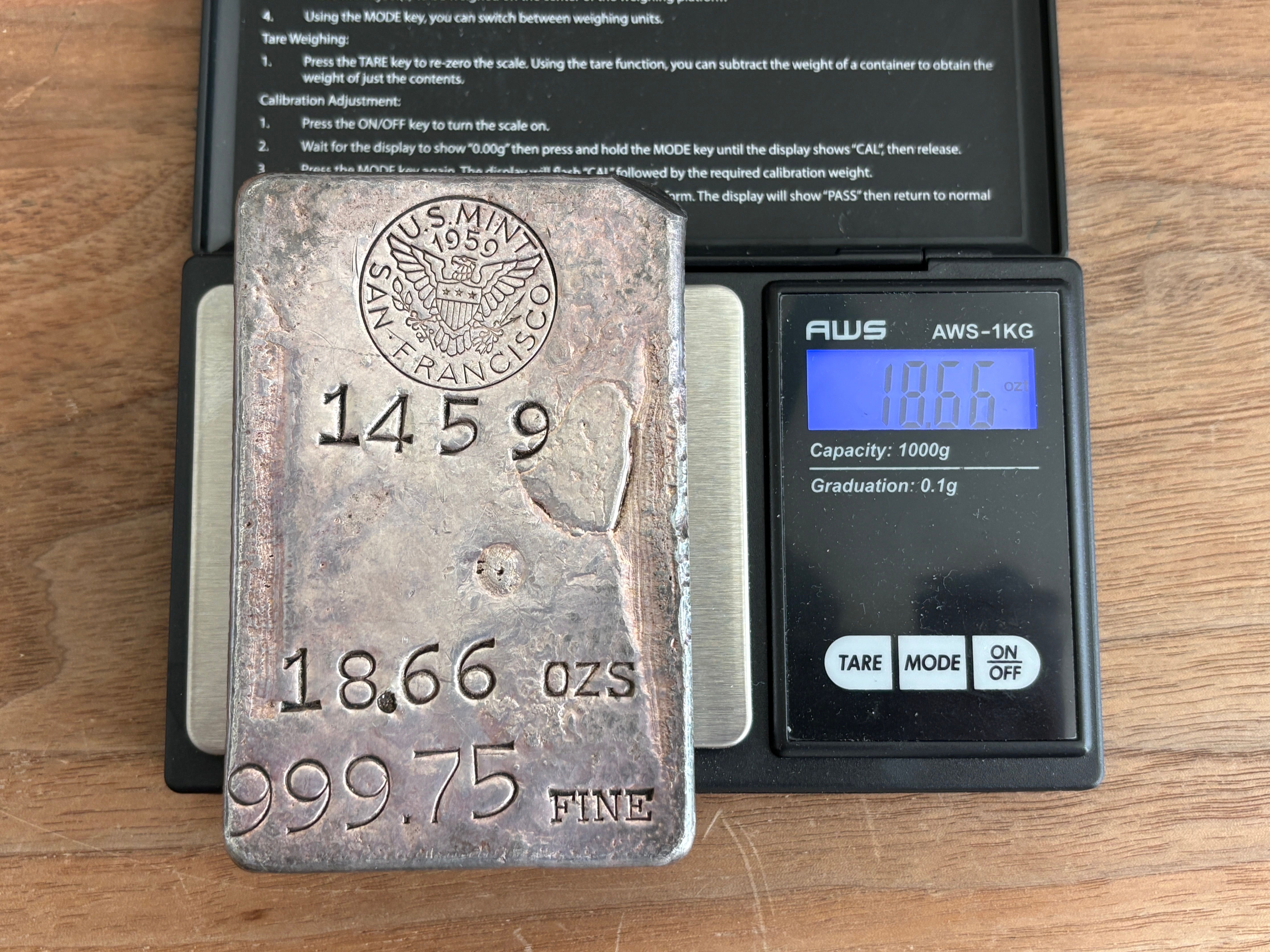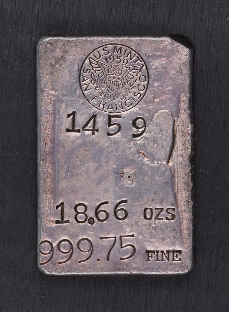 This is a San Francisco Mint ingot (also known as an "assay bar") that was made by the mint in 1959. The purpose was likely just as a mean to use some leftover silver from coin production and to sell these to the public for commercial purposes. This bar is unique by the presence of the assay chip on the upper right corner. This was a practice by assay offices for testing their own production for purity, dating back to the mid 19th century. The bar weighs exactly 18.66oz as stamped.