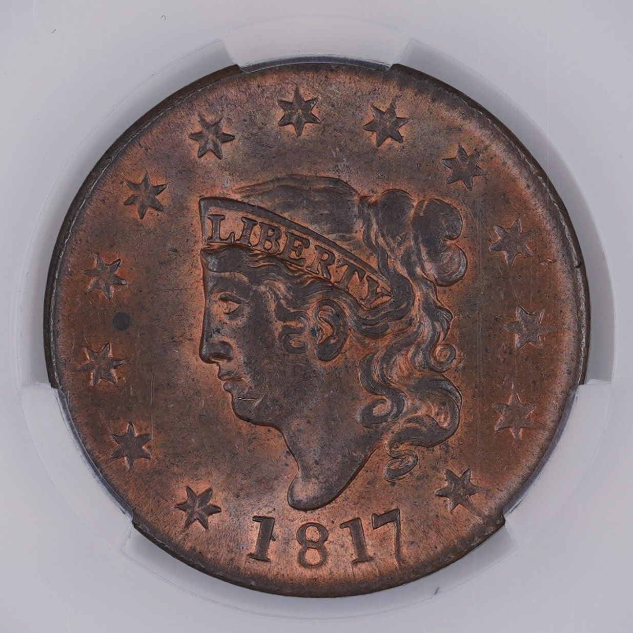 The 1817 Large Cent (or Matron Head cent) is a fairly common, readily available issue from the series. This particular coin is particularly nice, contains plenty of luster and has a strong amount of original red color remaining on the coin.