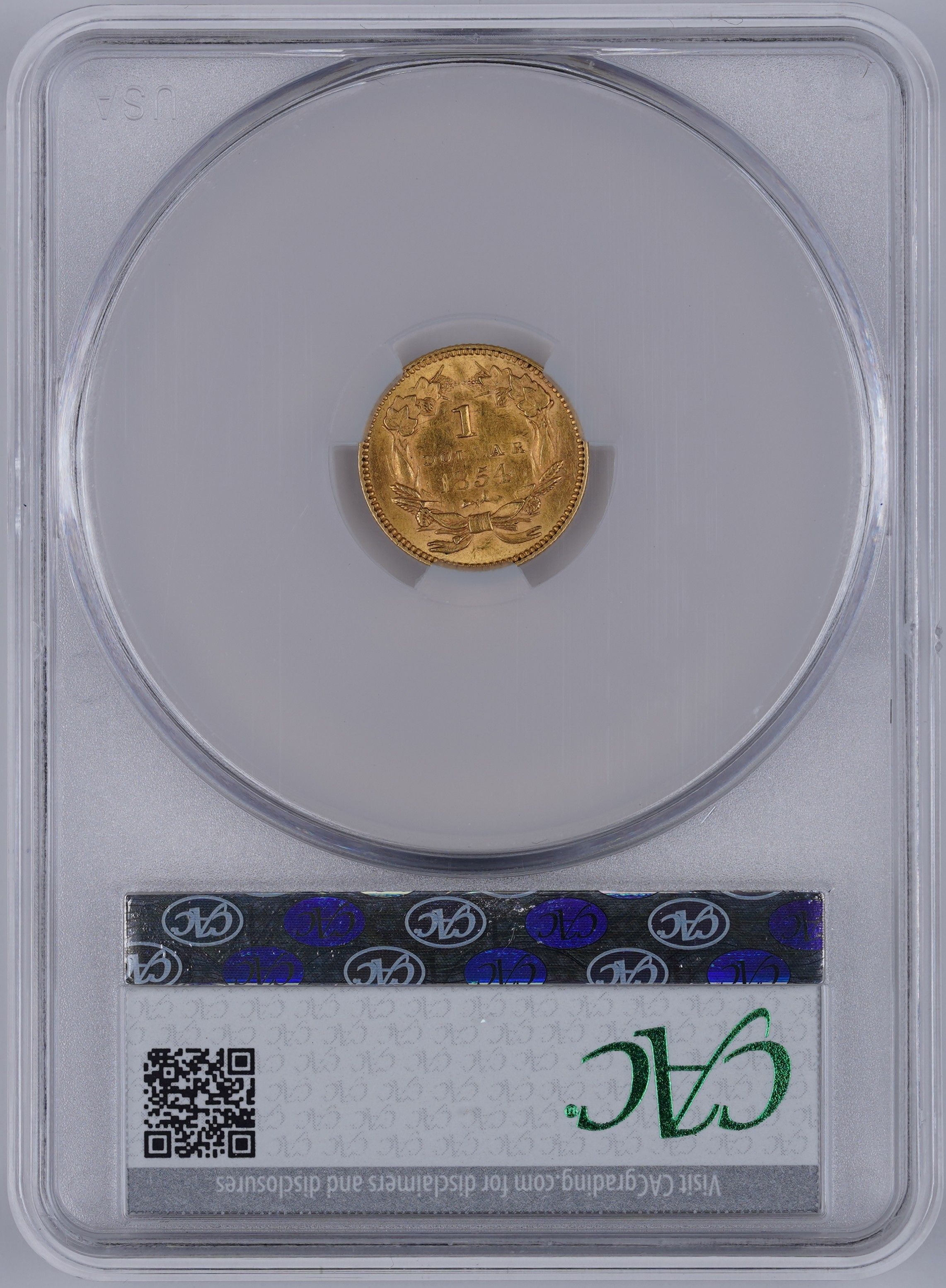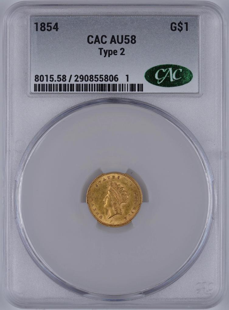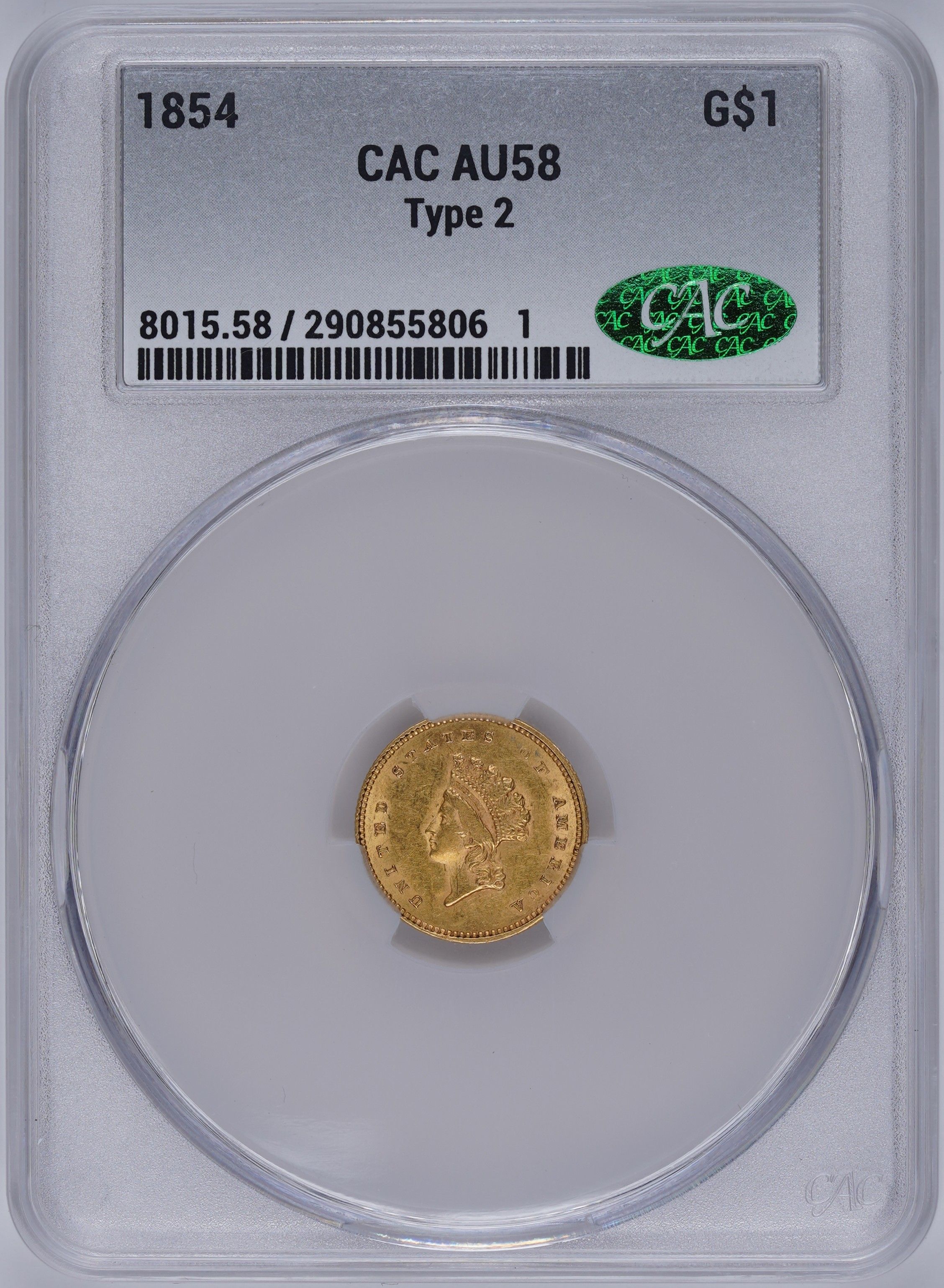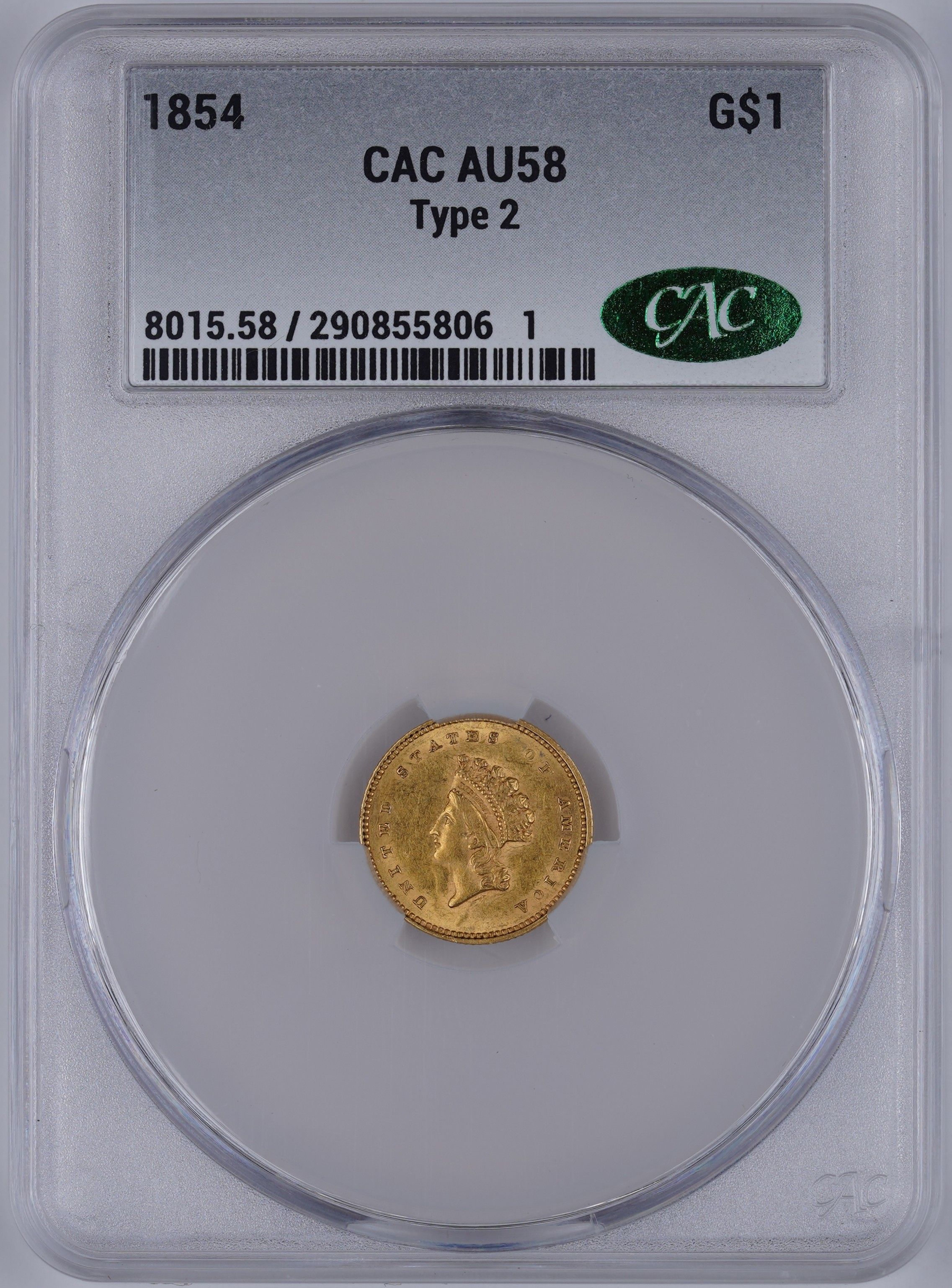 Type 2 gold dollars were only made for 3 years (1854-1856). Because of this, they are highly sought after by type collectors. A type collector is someone that attempts to get one nice example (or not so nice, depending on taste/style) of everytype of US coin. This particular example is graded AU58 by the CAC grading company and has great surfaces and eye appeal.