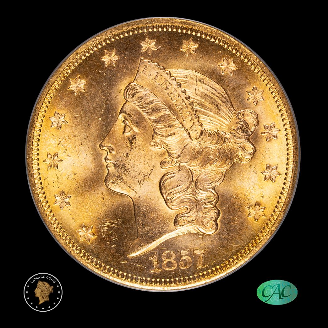 Gorgeous and original, as if it had been sitting in the bottom of the ocean since September of 1857. These pieces are well known in the coin market and everybody loves the gleam of the gold - as it should look without years of collector or dealer handling. Just a piece of Type 1 Double Eagle gold in Mint State - Beautiful! It comes with a presentation book and display case.