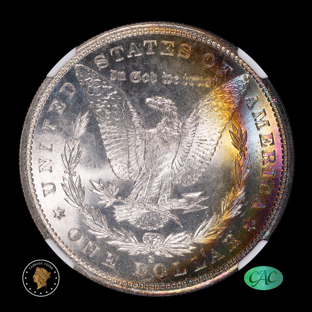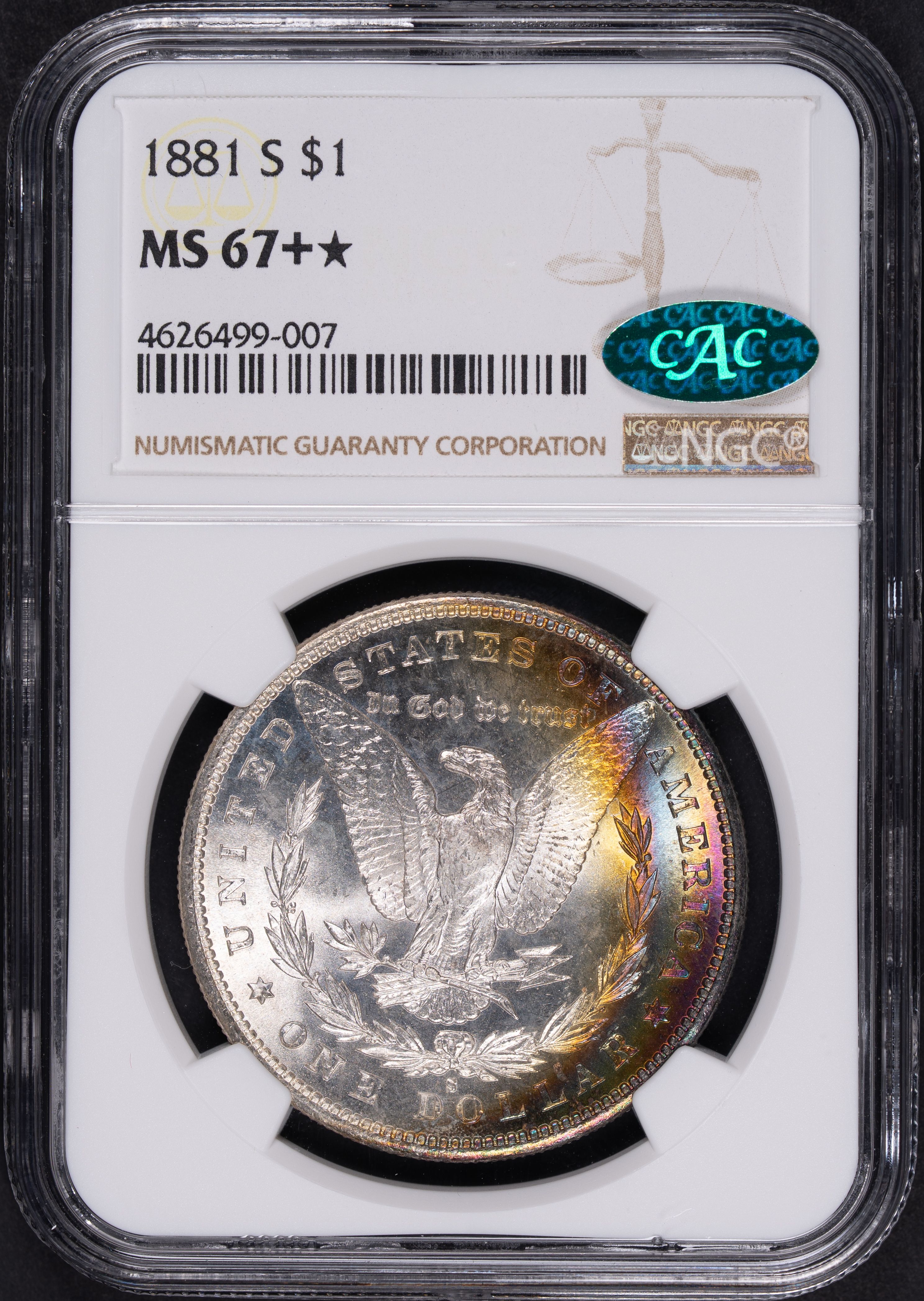 Definitely a common date, but this 1881-S is special. The rainbow crest toning and the luster of this MS67+ CAC Star make this a standout piece.