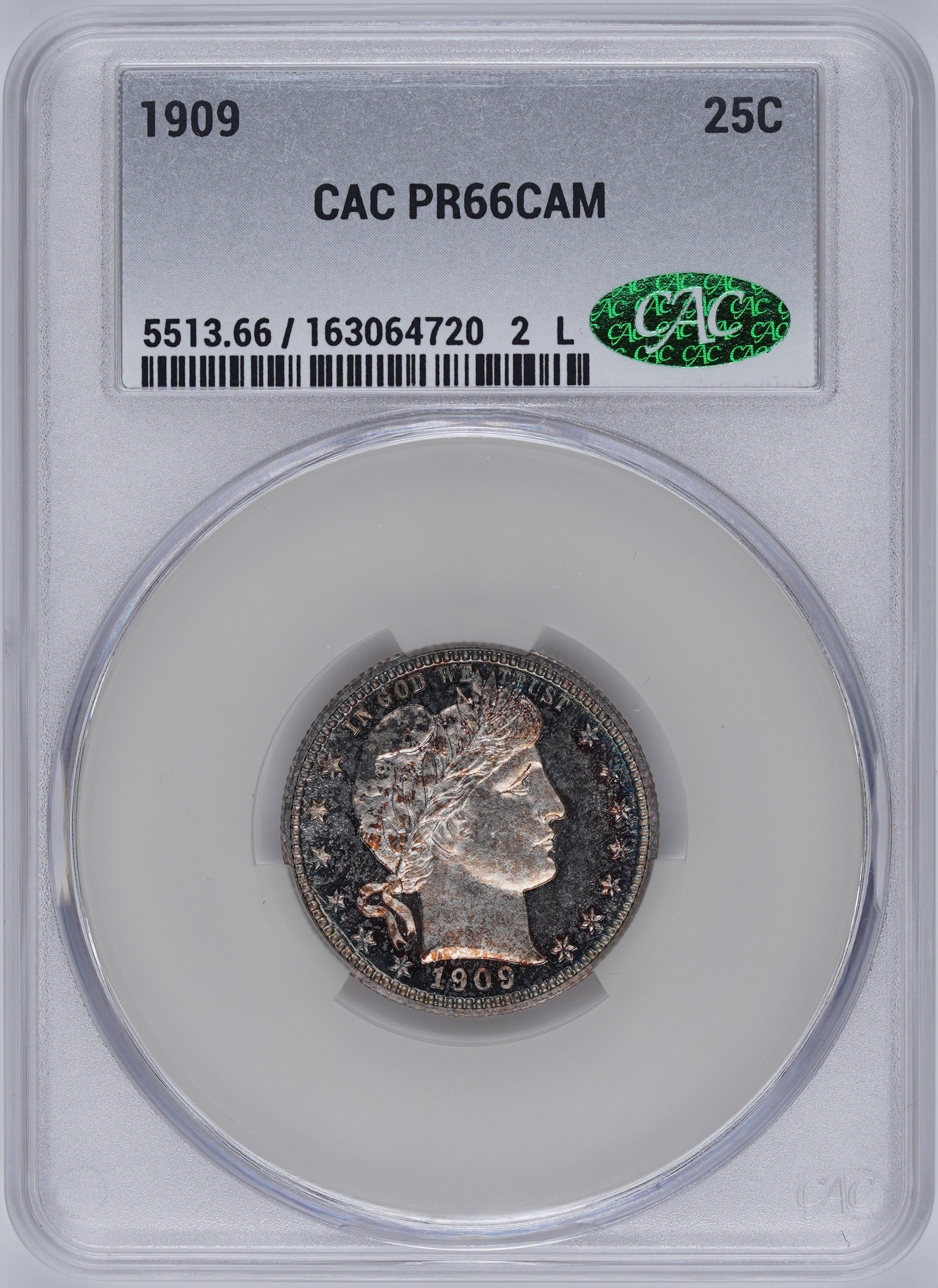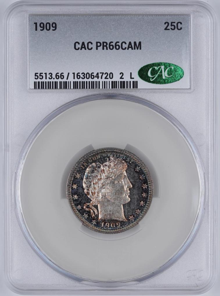 with a mintage of 650 coins, this 1909 proof quarter is a delight both in pics and in hand. These are coins preserved for generations by collectors. This example has very pleasing eye appeal and is both a CAMEO designation and graded by the stringest standards of CAC.