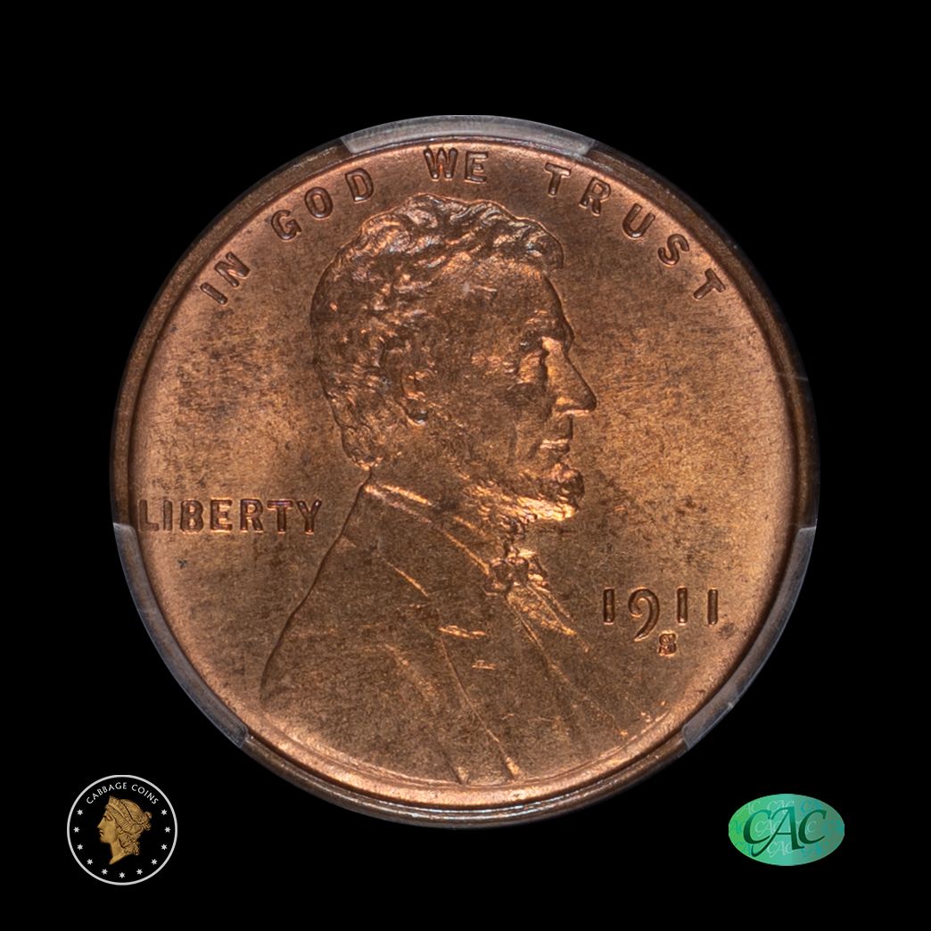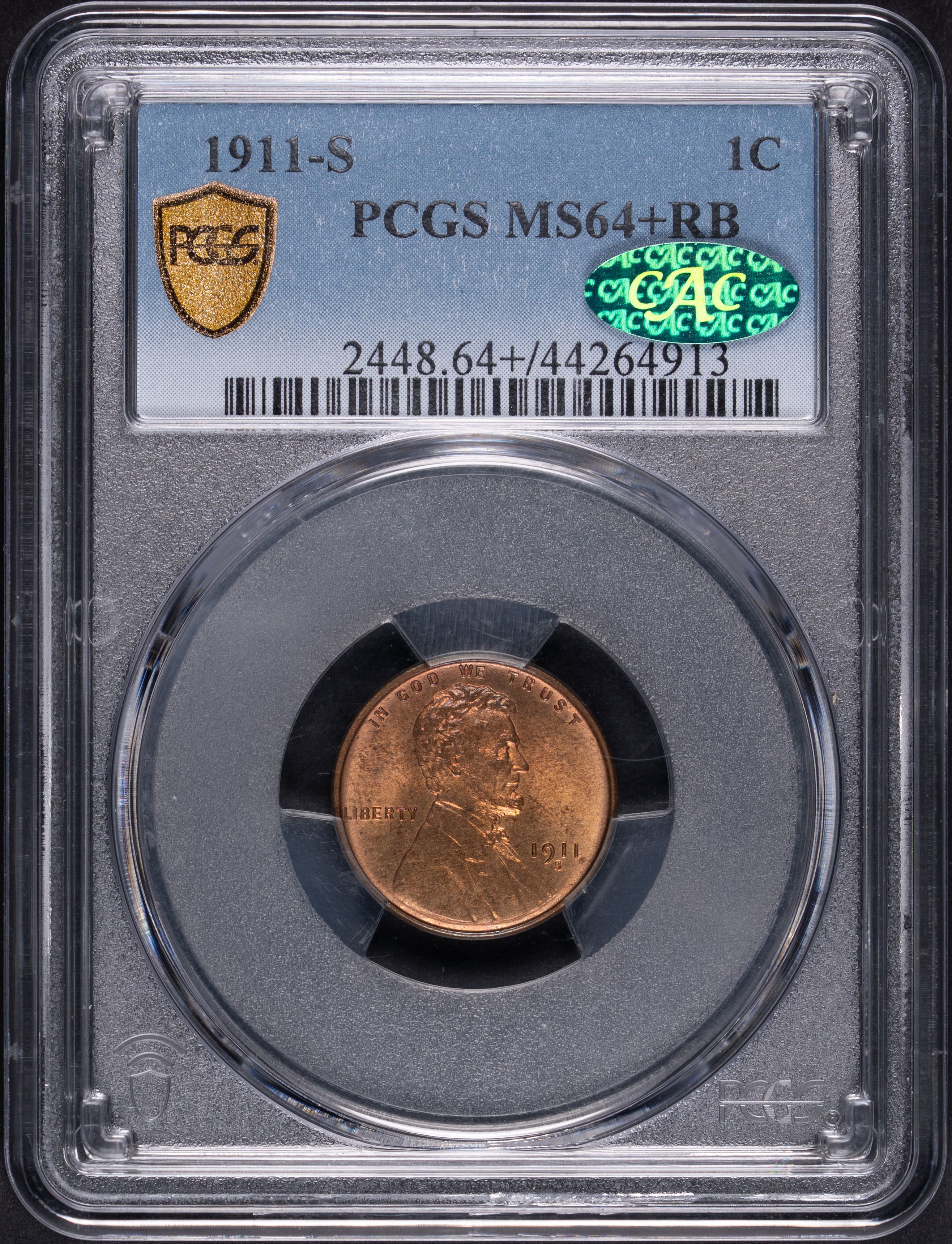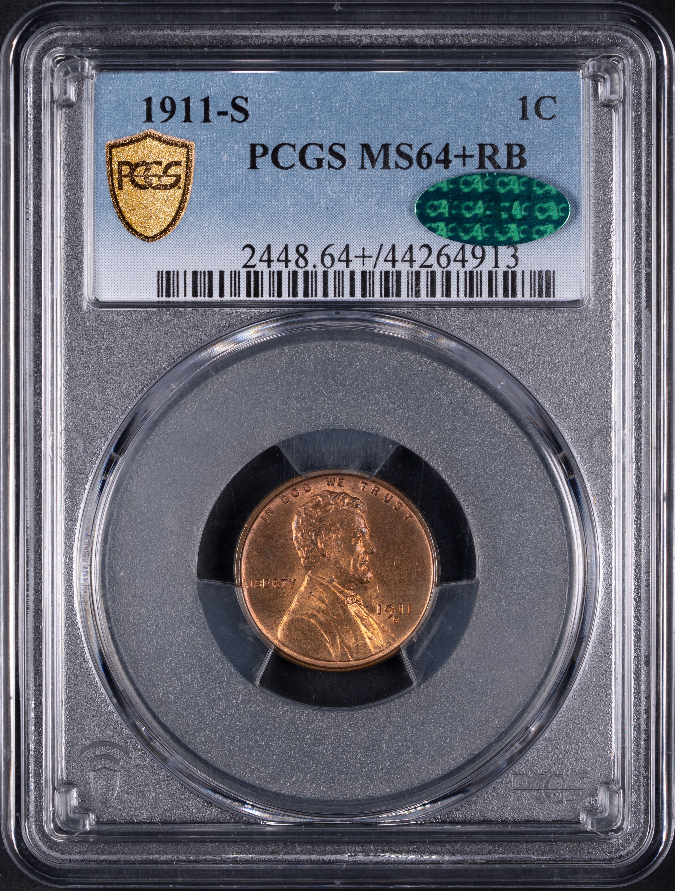 1911-S 1C Lincoln Cent PCGS MS64+RB CAC