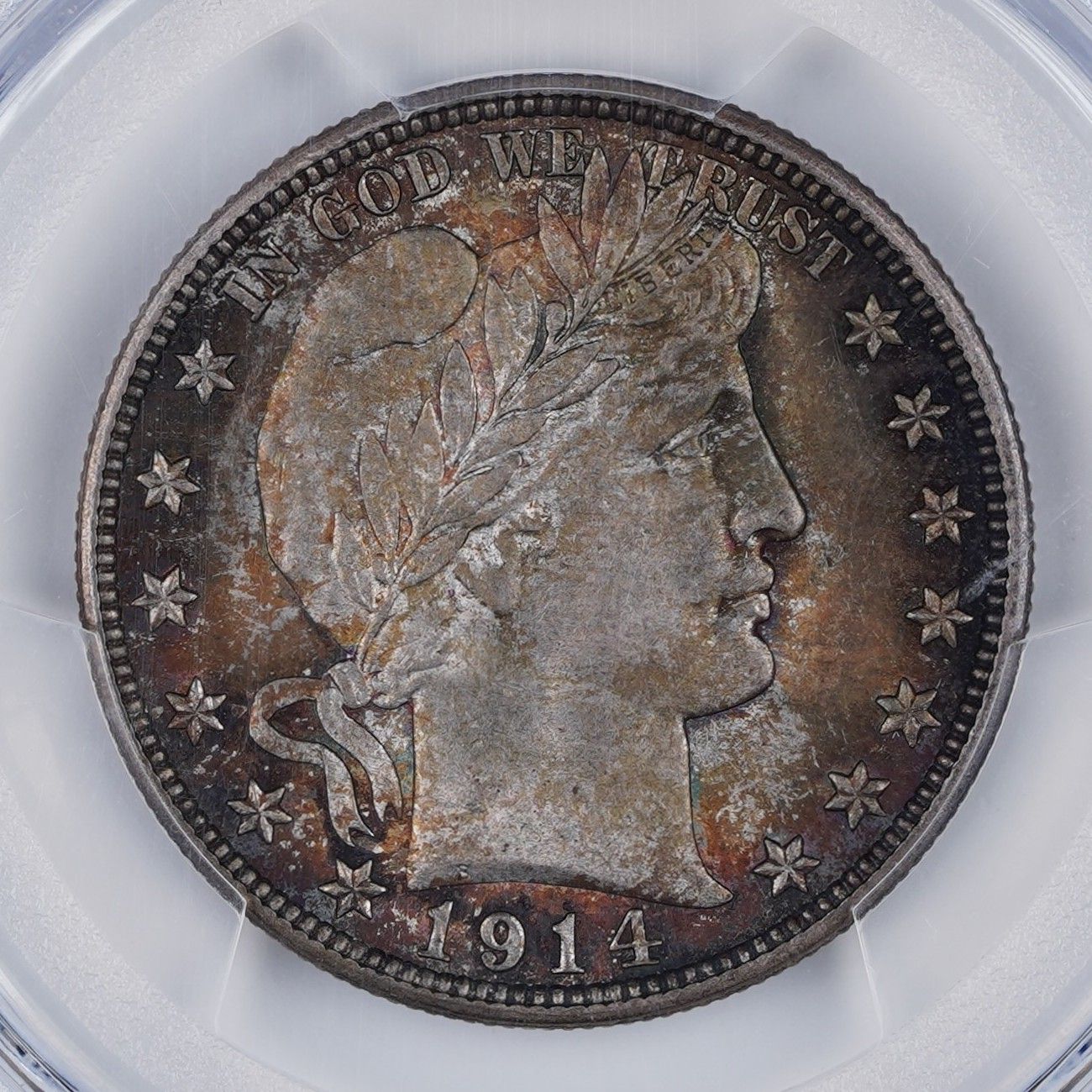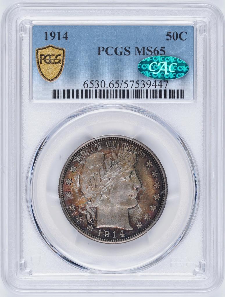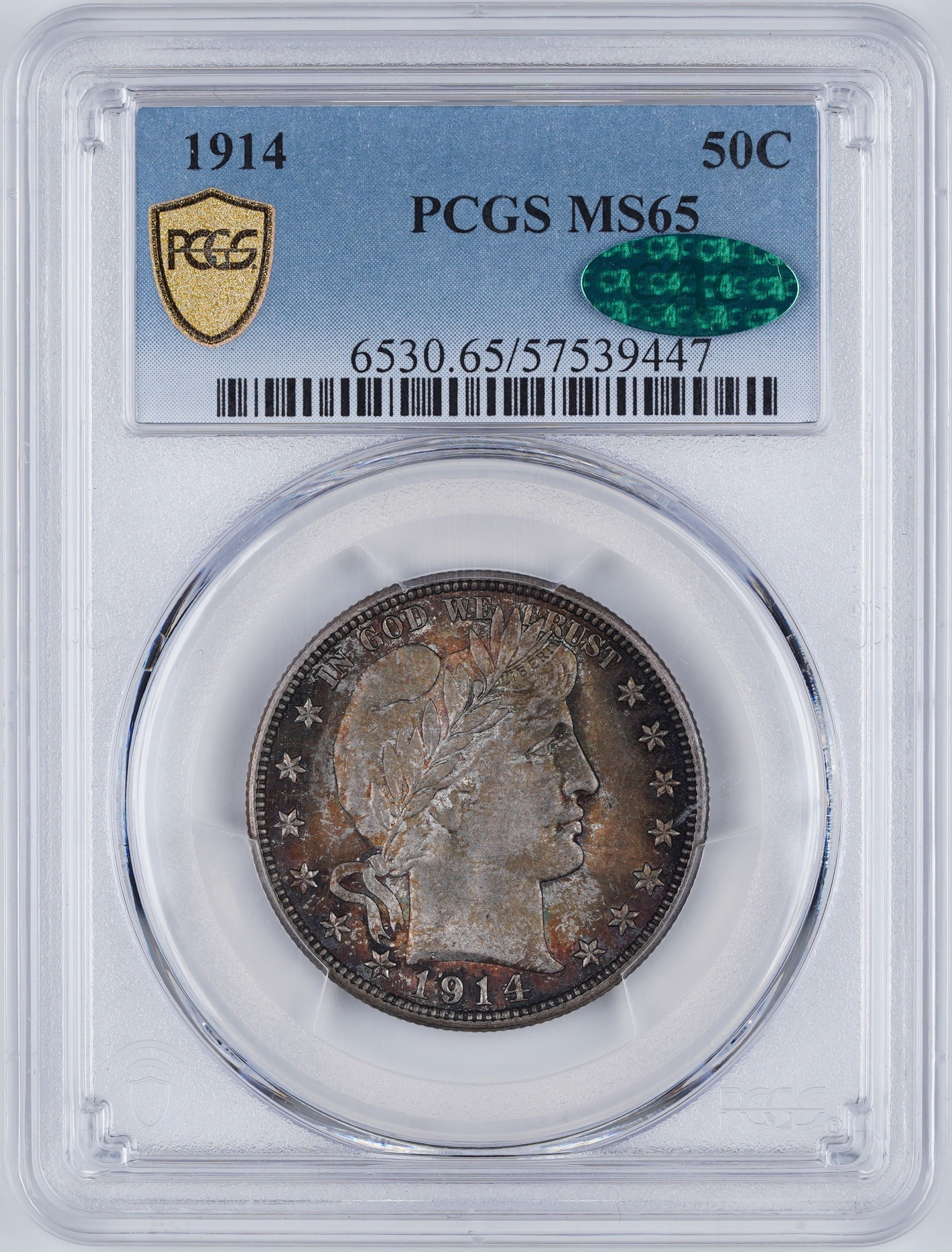 At a mintage of 124,230 coins, the 1914 Barber Half represents the LOWEST mintage of the barber half dollar series. Although circulated examples seem plentiful, the mint state coins are near impossible to find nice. This piece is one of the few MS65 coins at PCGS and surely in the top 10 census. It is the ONLY example with a CAC sticker at MS65