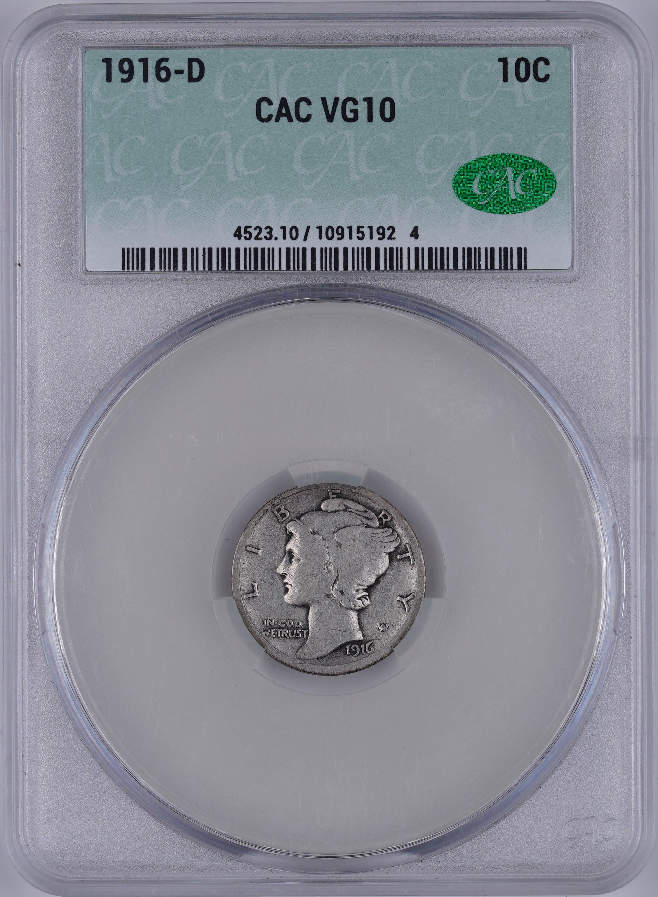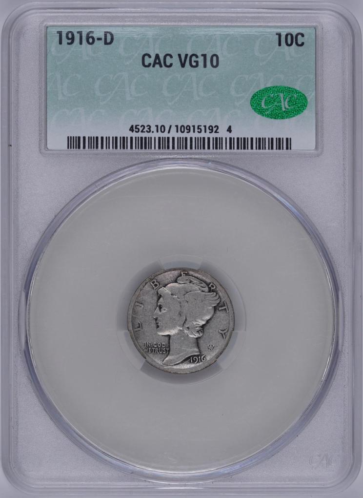 This is a great piece in the fact that 1916-D mercury dimes are fairly common in the lowest grades, but get more rare as the grades rise (more so than other key dates, in my opinion). Here's a piece graded very good 10 but also has the certification of CAC at that grade level.